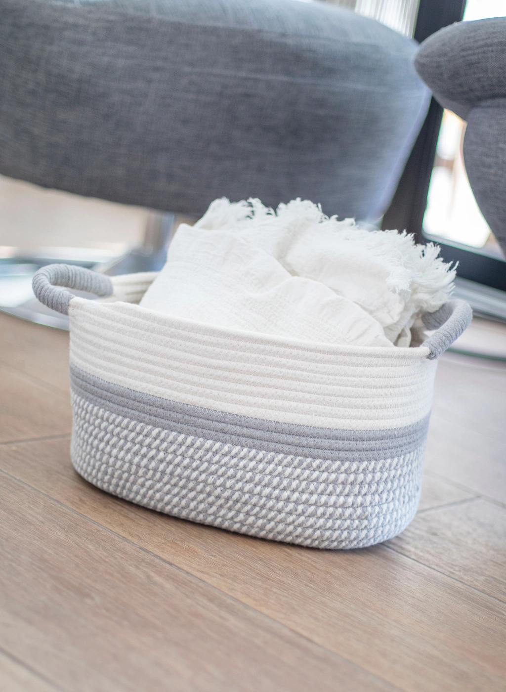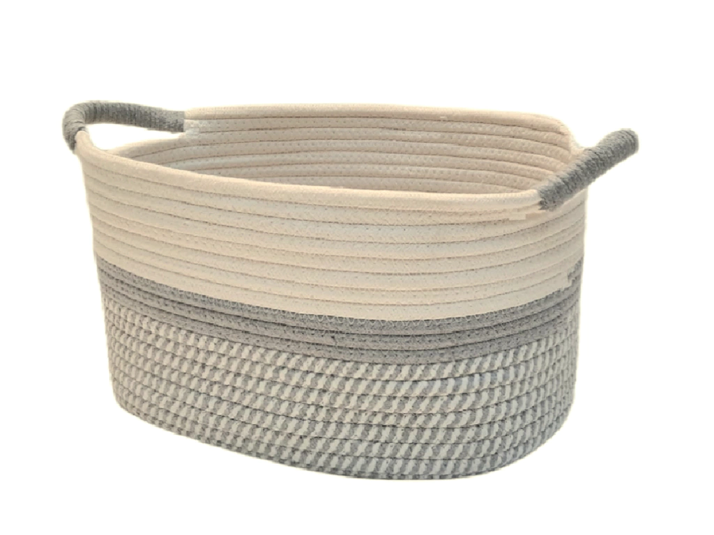 Canasto ovalado en cuardas de algodon gris y crudo.